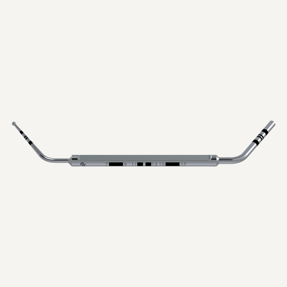 Depth Gauge Probe – It has two sides with drill markings and different functions. One side is fitting in the preparation osteotomy made by the Ø 2.2 mm drill and has, apart from the depth markings, a ball end for inspection of the bone surface with tactile feel. The other side is for the preparation osteotomy made by the Ø 3.0 mm drill and larger to verify drill depth. The handle is shaped to improve ergonomic handling for the user.